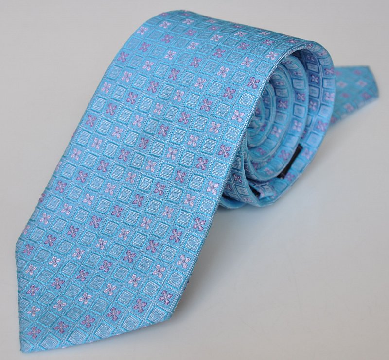 Luxusní kravata v módním střihu z 100% hedvábí s krásným vzorem v tyrkysovo-modré barvě s fialovými vytkávanými detaily. Ze zadní stany je našité poutko v stejných barvách k uchycení tenčího konce kravaty, aby kravata vypadala úhledně zavázaná. Délka kravaty: 158 cm Šířka kravaty: 8 cm Materiál: 100% hedvábí